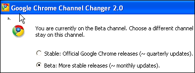 Sau đó, bạn tải công cụ Channel Changer từ địa chỉ http://tinyurl.com/ygmhebv, sau đó bạn mở chương trình lên, trong dòng You are currently on the Beta channel. Choose a different channel and click Update, or click Close to stay on this channel bạn hãy đánh chọn mục Beta: More stable releases (~ monthly updates) rồi nhấn Update để xác nhận chọn lựa.