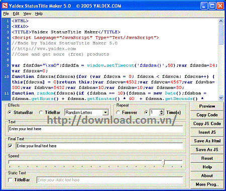 Yaldex StatusTitle Maker là tiện ích dành cho các bạn thiết kế web. Chương trình sẽ giúp bạn tạo ra các hiệu ứng cho thanh tiêu đề hoặc thanh trạng thái với 19 hiệu ứng như : ẩn hiện text, gõ văn bản....