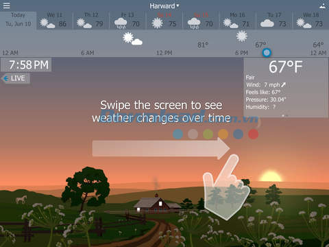 Thời điểm mặt trời mọc và lặn trên YoWindow cũng khớp với thời gian thực tế. Ngoài ra, thao tác vuốt màn hình YoWindow cũng giúp bạn theo dõi sự thay đổi của thời tiết trong cả một ngày thật dễ dàng!