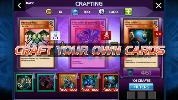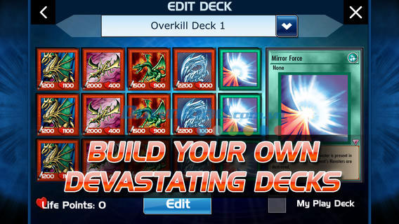 Trở thành vua trò chơi số một bằng cách xây dựng một cỗ bài có một không ai, thỏa sức lựa chọn từ hơn 500 lá bài Yu-Gi-Oh! nguyên bản và huyền thoại! Nâng cấp cỗ bài của mình bằng cách kết hợp những lá bài chưa từng sử dụng để tạo ra các loại thẻ bài mạnh mẽ, quý hiếm hơn. Thử thách bạn bè và đối phương để chiếm đóng Duel Arena bằng kỹ năng và kinh nghiệm quý báu của bạn!