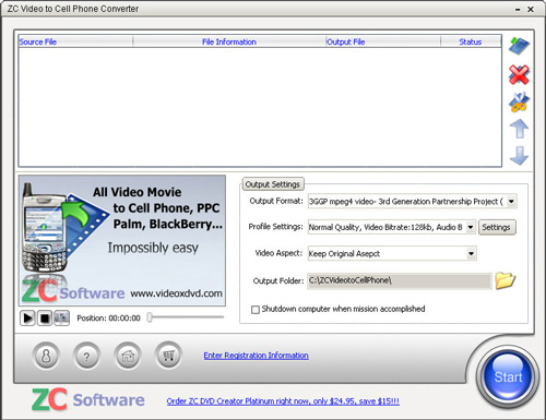 ZC Video to Cell Phone Converter giúp chuyển đổi hầu hết các định dạng phim và audio nhạc phổ biến sang định dạng điện thoại đi động, BlackBerry, Palm, Symbian, Windows mobile,…hỗ trợ và trích xuất audio từ video. Phần mềm này hỗ trợ hầu hết các định dạng video phim phổ biến như AVI, DivX (*.divx; *.div), Xvid (*.xvid), MPEG (*.mpeg; *.mpg), WMV (*.wmv), ASF (*.asf), ASX (*.asx), Real Video(*.rm;*.rmvb), VCD Format (*.dat), Quick Time Format (*.mov), FLV (*.flv), MP4 (*.mp4; *.mpeg4), MKV (*.mkv), 3GP (*.3gp;*.3gpp;*.3gp2;*.3g2), Decrypted VOB(*.vob), Nullsoft Video(*.NSV) . Nói chung, đây là phần mềm chuyển đổi video và rip audio đối với tất cả các nguồn nhạc và phim cho thiết bị điện thoại của bạn. Giao diện trực quan của chương trình sẽ giúp việc chuyển đổi và rip audio trở lên dễ dàng hơn. Với phần mềm ZC Video to Cell Phone Converter, bạn đã có thể tận hưởng các file phim và nhạc trên điện thoại ở bất kì nơi nào.