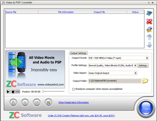ZC Video to PSP Converter sẽ giúp người dùng chuyển đổi hầu hết các video phim sang video và audio Sony PSP hỗ trợ. Phần mềm này hỗ trợ hầu hết các định dạng phổ biến trên mạng như AVI, DivX (*.divx; *.div), Xvid (*.xvid), MPEG (*.mpeg; *.mpg), WMV (*.wmv), ASF (*.asf), ASX (*.asx), Real Video(*.rm;*.rmvb), VCD Format (*.dat), Quick Time Format (*.mov), SWF (*.swf), FLV (*.flv), MP4 (*.mp4; *.mpeg4), 3GP (*.3gp;*.3gpp;*.3gp2;*.3g2), Decrypted VOB(*.vob), Nullsoft Video(*.NSV),… Đây là giải pháp một lần kích đối với các nguồn phim trực tuyến khi chuyển đổi chúng sang định dạng audio và video PSP. Với phần mềm ZC Video to PSP Converter, bạn đã có thể tận hưởng các bộ phim yêu thích rất dễ dàng.
