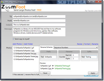 Để thuận tiện hơn, ZoomFoot có thể thay đổi kích cỡ tất cả các bức ảnh của bạn, thay đổi định dạng của chúng hoặc thậm chí thay đổi tên trong một bước duy nhất. ZoomFoot Send Photo làm việc với các ảnh JPEG, RAW, TIFF, PSD, PNG, GIF.
