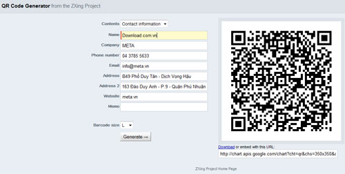 Sau đó chỉ cần nhập vào các thông tin cho các trường bên dưới rồi ấn nút Generate để chương trình tạo mã QR cho bạn.